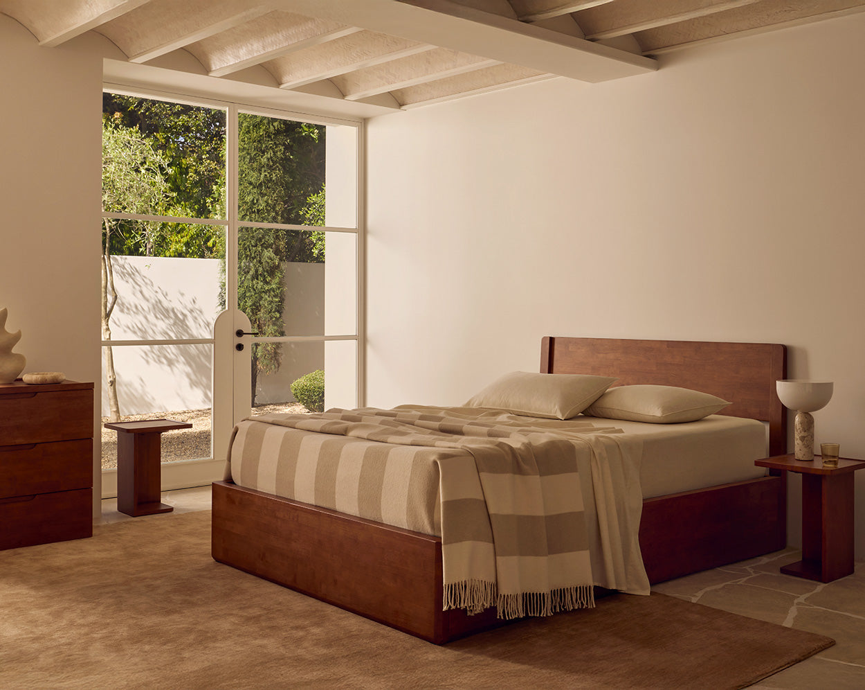 Designed as a statement piece for the bedroom, with its full wraparound panels and sculptural silhouette. Features Japanese joinery for tool-free assembly, solid wooden construction and optional storage.